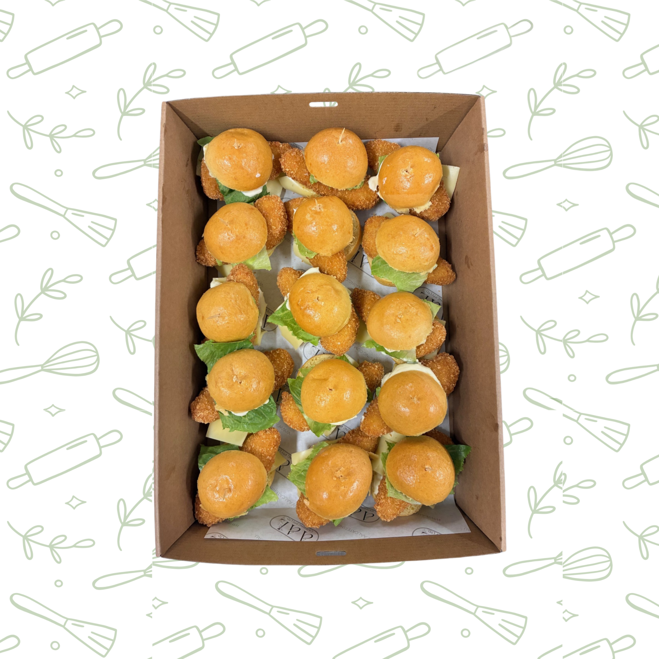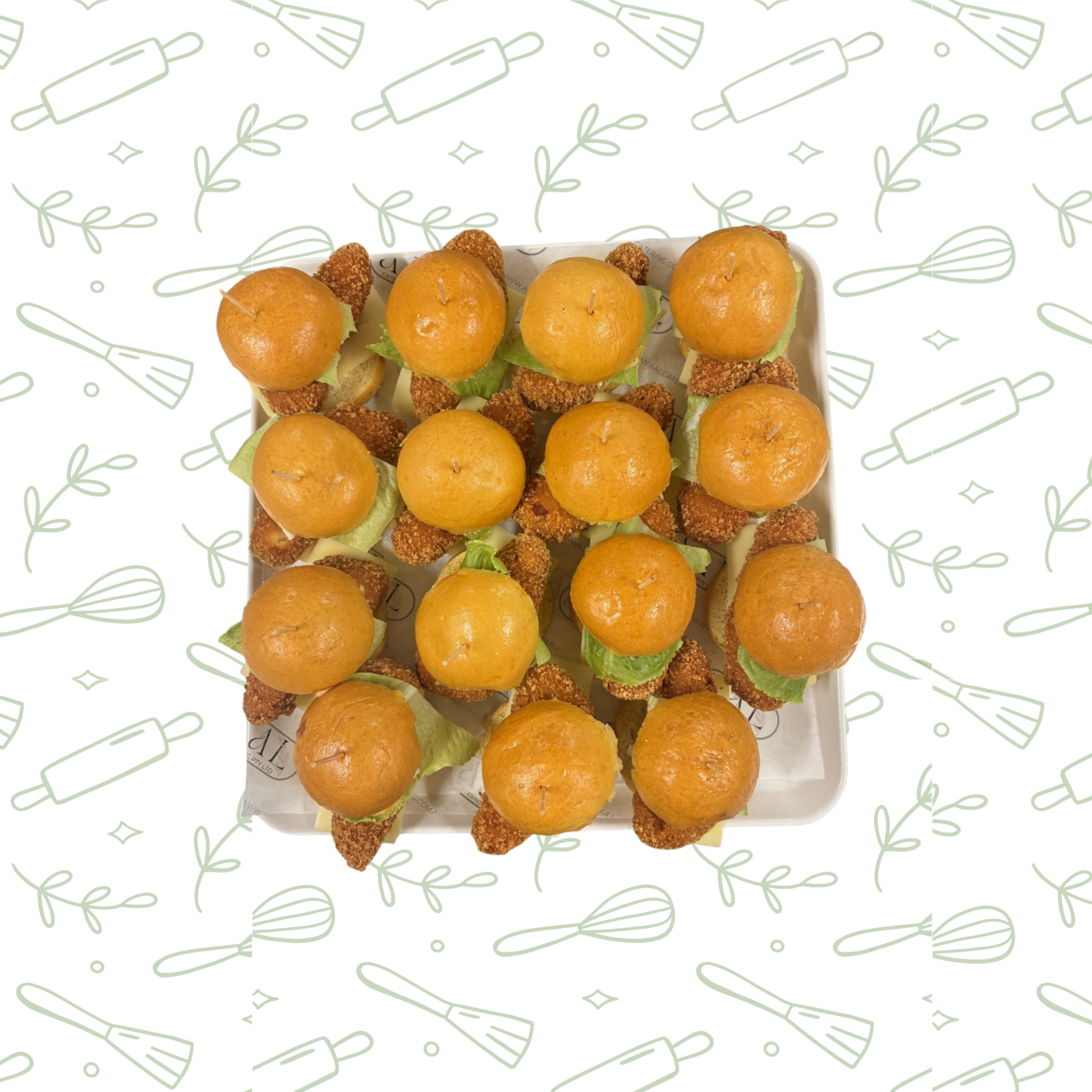 Chicken schnitzel sliders. A homemade chicken schnitzel, cheese and our special sauce (H)