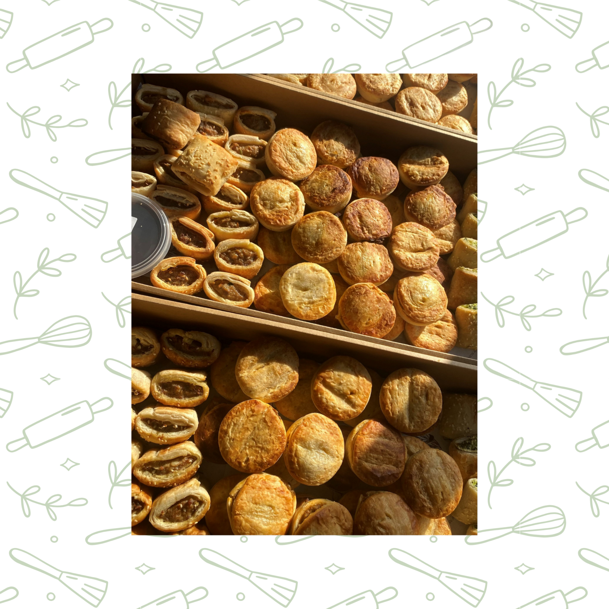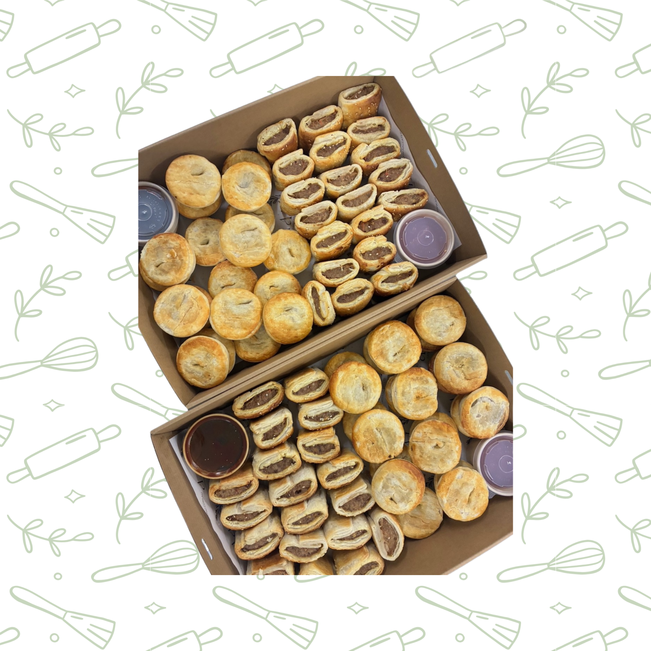 Homemade pies and sausage rolls served with tomato and BBQ sauce