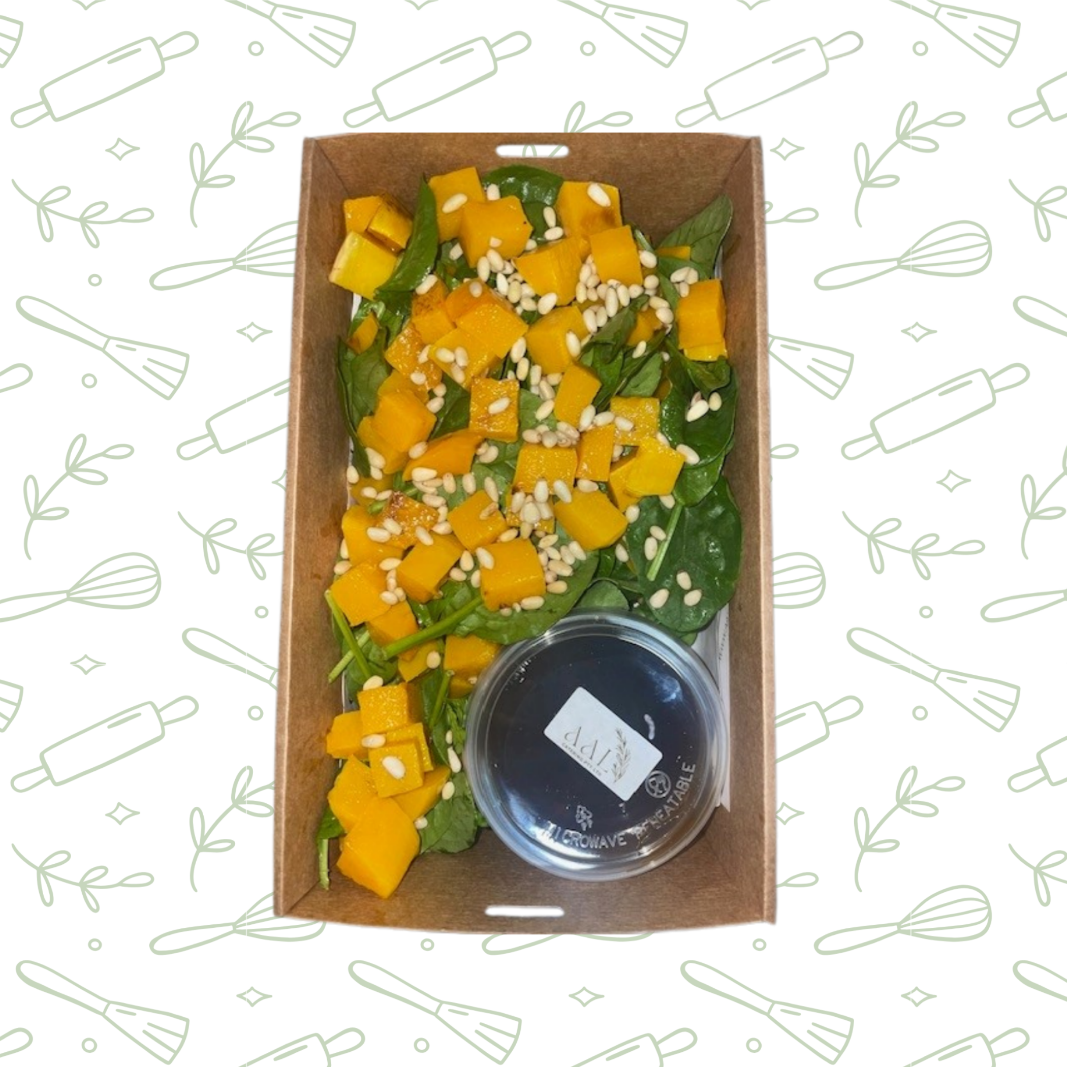 roast pumpkin, spinach, feta & pine nuts with a balsamic vinaigrette dressing (VE/GF)