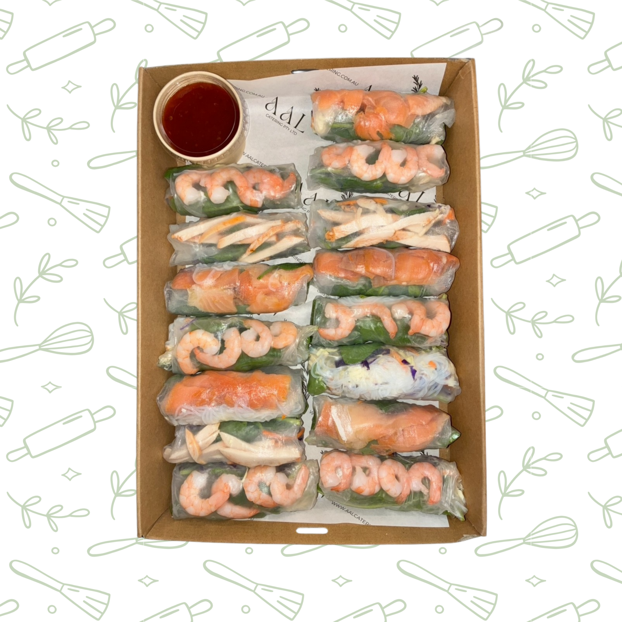 a combination of salmon rice paper rolls & prawn rice paper rolls served with sweet chilli sauce (GF)