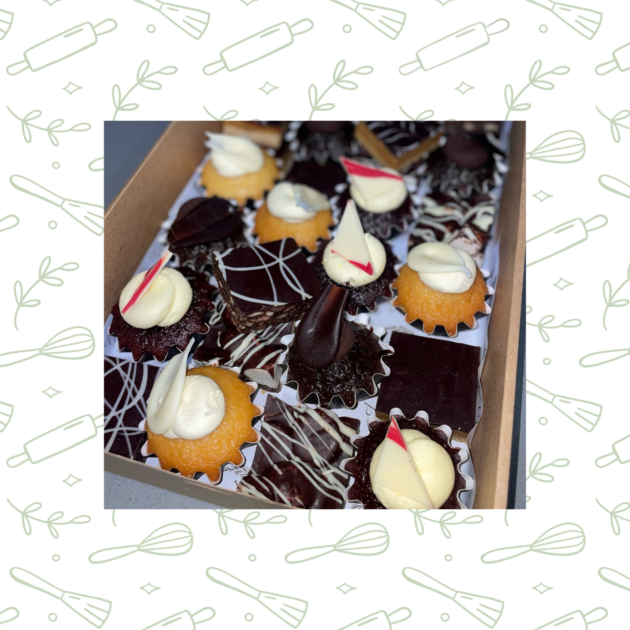 an assortment of mini cakes, mini donuts & slices